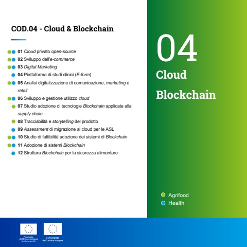 SSeerrvviizzii-- TTeessttBBeeffoorree IInnvveesstt 33Lorem ipsum dolor sit amet501 Cloud privato open-source02 Sviluppo dell'e-commerce03 Digital Marketing04 Piattaforma di studi clinici (E-form)05 Analisi digitalizzazione di comunicazione, marketing eretail06 Sviluppo e gestione utilizzo cloud07 Studio adozione di tecnologie Blockchain applicate allasupply chain08 Tracciabilit%u00e0 e storytelling del prodotto09 Assessment di migrazione al cloud per le ASL10 Studio di fattibilit%u00e0 adozione dei sistemi di Blockchain11 Adozione di sistemi Blockchain12 Struttura Blockchain per la sicurezza alimentareCOD.04 - Cloud & Blockchain04Cloud BlockchainSSeerrvviizzii-- TTeessttBBeeffoorree IInnvveesstt 33Lorem ipsum dolor sit ametServizi - Test Before Invest 53Lorem ipsum dolor sit amet5Servizi -Test before Invest11AgrifoodHealth
