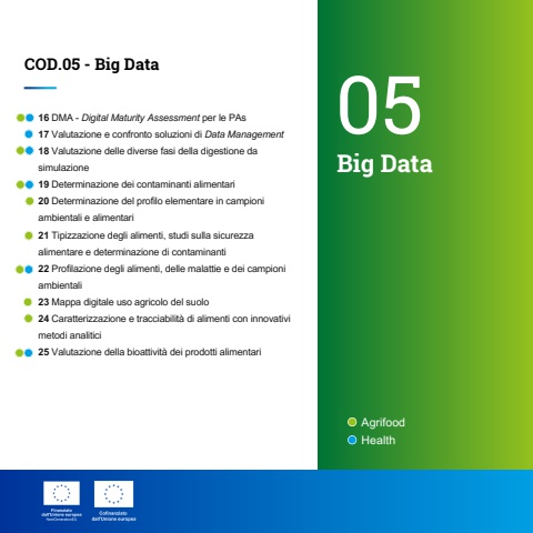 SSeerrvviizzii-- TTeessttBBeeffoorree IInnvveesstt 33Lorem ipsum dolor sit amet516 DMA - Digital Maturity Assessment per le PAs17 Valutazione e confronto soluzioni di Data Management18 Valutazione delle diverse fasi della digestione dasimulazione19 Determinazione dei contaminanti alimentari20 Determinazione del profilo elementare in campioniambientali e alimentari21 Tipizzazione degli alimenti, studi sulla sicurezzaalimentare e determinazione di contaminanti22 Profilazione degli alimenti, delle malattie e dei campioniambientali23 Mappa digitale uso agricolo del suolo24 Caratterizzazione e tracciabilit%u00e0 di alimenti con innovativimetodi analitici25 Valutazione della bioattivit%u00e0 dei prodotti alimentariCOD.05 - Big Data05Big DataSSeerrvviizzii-- TTeessttBBeeffoorree IInnvveesstt 33Lorem ipsum dolor sit ametServizi - Test Before Invest 53Lorem ipsum dolor sit amet5Servizi -Test before Invest13AgrifoodHealth