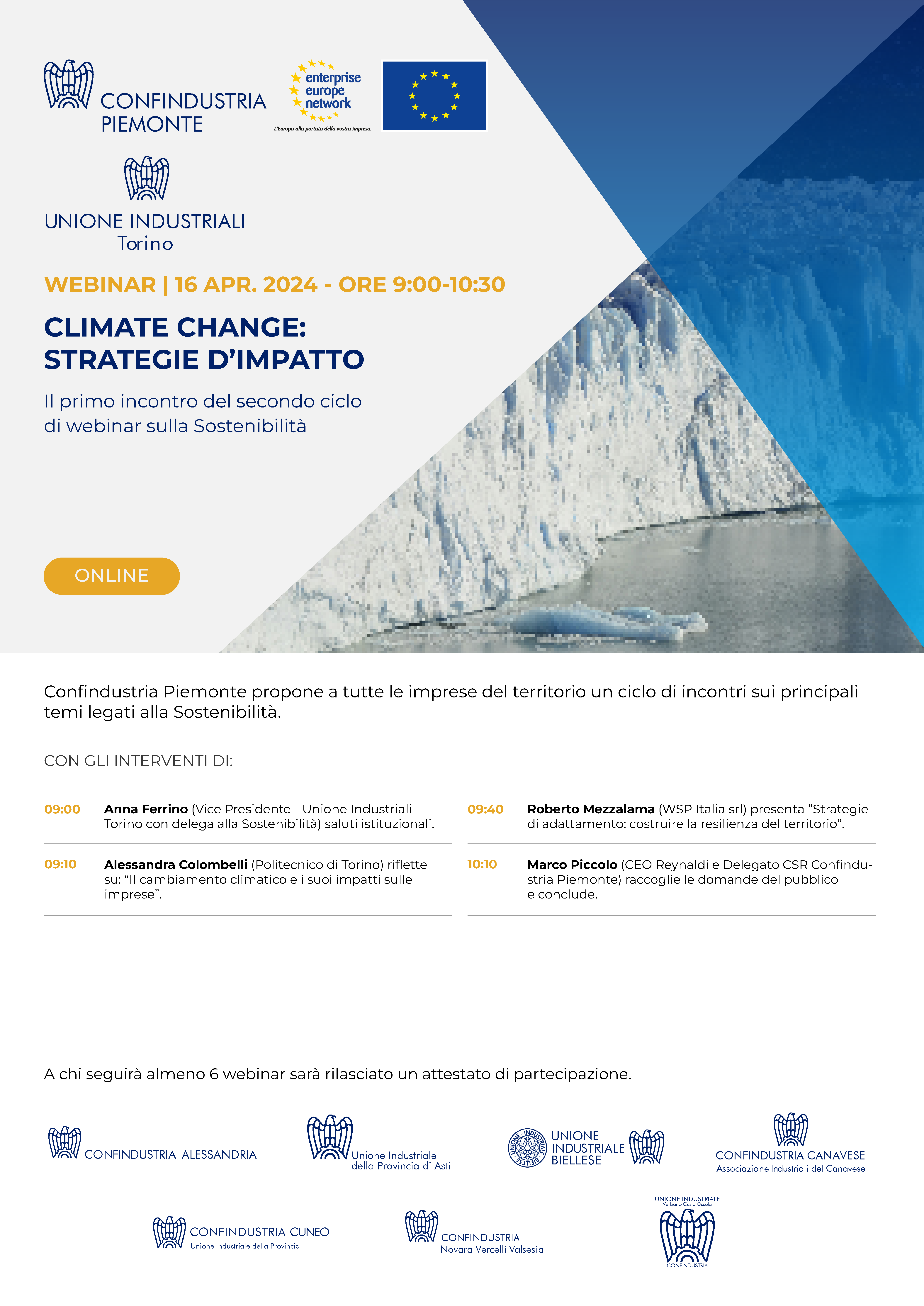 “Climate Change: strategie d’impatto” sarà il primo webinar di questo ciclo e si svolgerà il 16 aprile, dalle 9.00 alle 10.30.