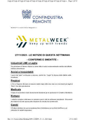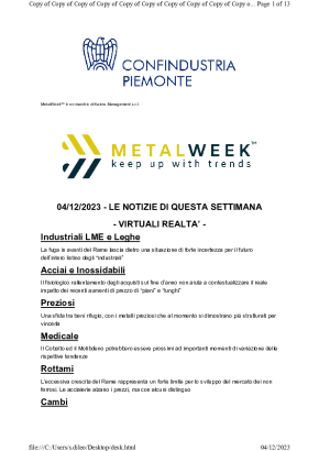 Con cadenza settimanale, dedicata all'analisi dell'andamento dei prezzi dei metalli. Si concentra sui trend più recenti, sulle previsioni di breve e di lungo periodo e sull'influenza dei tassi di cambio sull'acquisto di metalli e leghe.